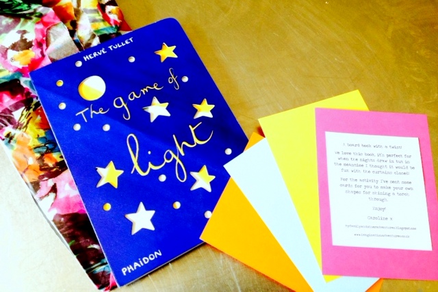 Activity:”We love Hervé Tullet”in our household. While I love picture books with stories and great illustrations I also love those that aren’t stories but a platform for coming up with your own. The book I chose is part of a huge series of books that offer different games. This book, “the game of light” is a fab book for the dark. Make up a story as you shine a torch through all the different shapes. The activity included was simply lots of different colored cards to encourage children to come up with their own shapes for telling their own story.”