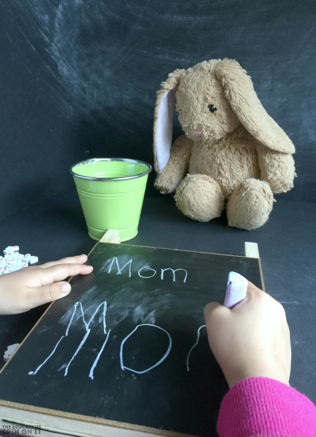 TIP: Younger children might need a little extra help by writing the name first and then the child copies their name onto the chalkboard. We use this mini chalkboard/dry erase board for projects like this. Another way to help them along is to write a list of family names that they can copy the letters and play this Easter Themed game with rabbits.