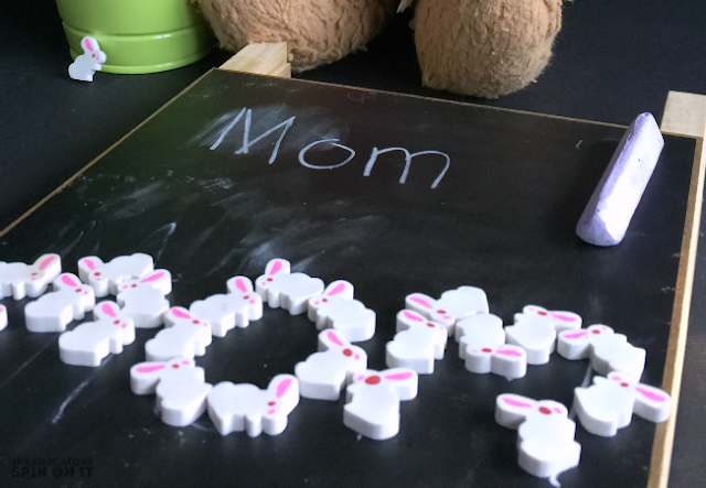 3. After they write their name with the chalk on theChalkboard,encourage your child to take theRabbit Erasersandtrace the letters in their name by placing the rabbits along the lines.